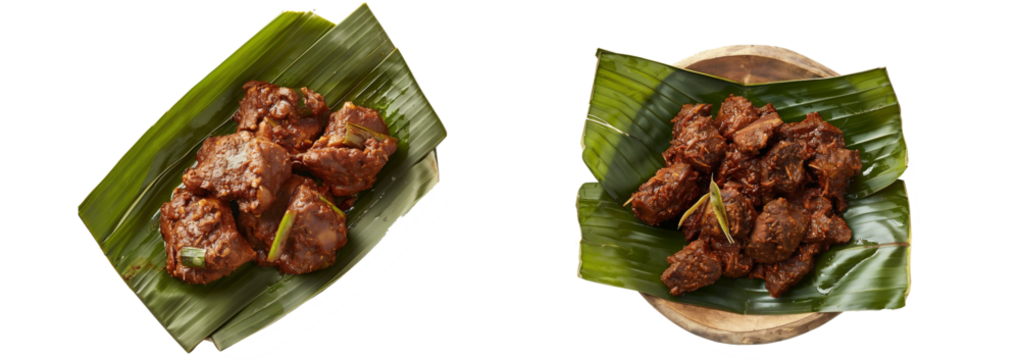 Rendang from West Sumatra is served on banana leaves, on transparent background