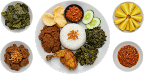 Set of A Classic Serving of Nasi Padang: Rice with a Variety of Meat and Vegetable Dishes, Including Ayam Goreng and Fish Curry on transparent png background. Ai generated