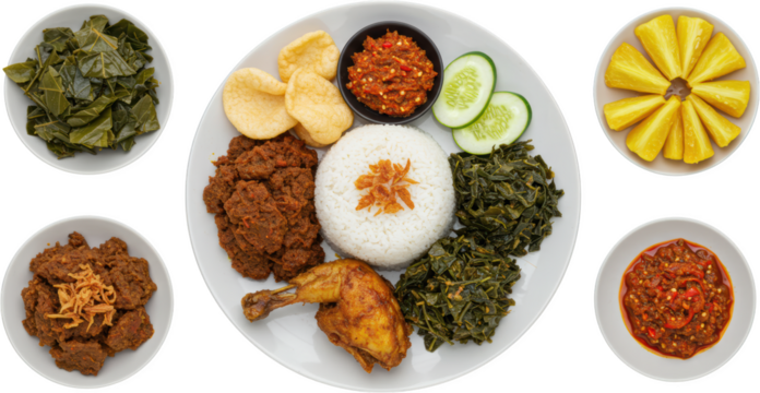 Traditional Nasi Padang Plate with Rendang and Side Dishes, isolated on transparent background PNG