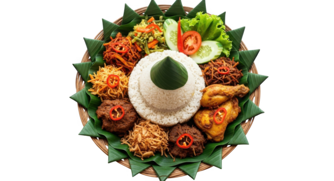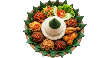 A Majestic Indonesian Nasi Tumpeng a Ceremonial Cone-Shaped Rice Dish on isolated transparent background