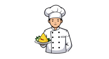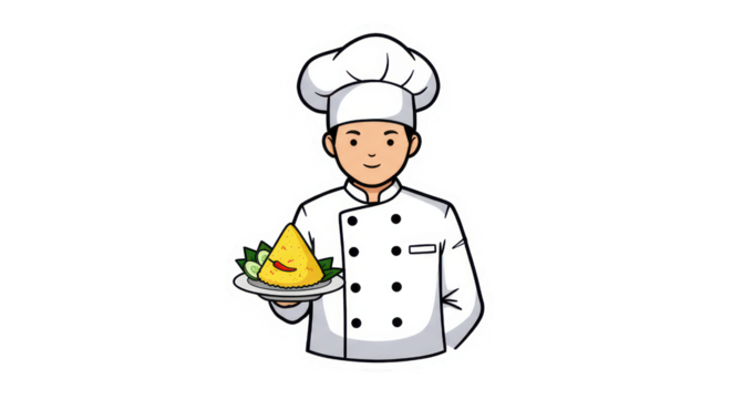 Smiling Cartoon Chef Holding Plate of Indonesian Nasi Tumpeng