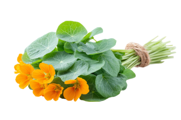 Freshly picked nasturtium bouquet with vibrant orange flowers and green leaves against a white background.