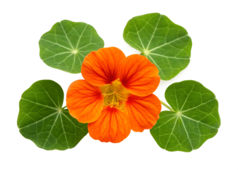 Closeup of a vibrant orange nasturtium flower surrounded by lush green leaves against a gray background transparent background Generative AI