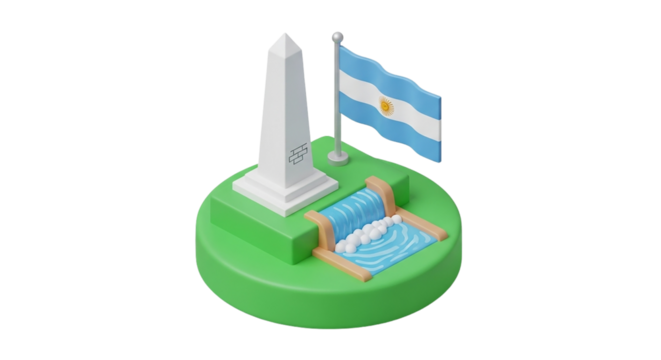 Buenos Aires Obelisco Argentina s national landmark Waving flag flowing waterfall Iconic travel tourism culture 3D