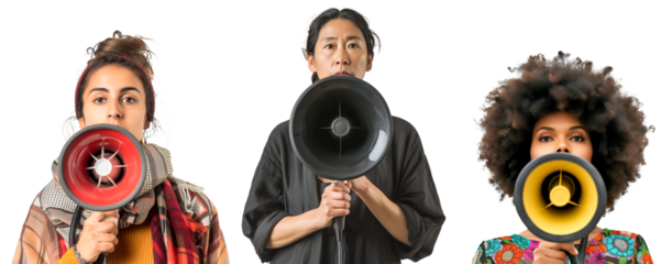 Female activist from different ethnicities and nationalities with megaphone, rising their voices for equality. Isolated over transparent background