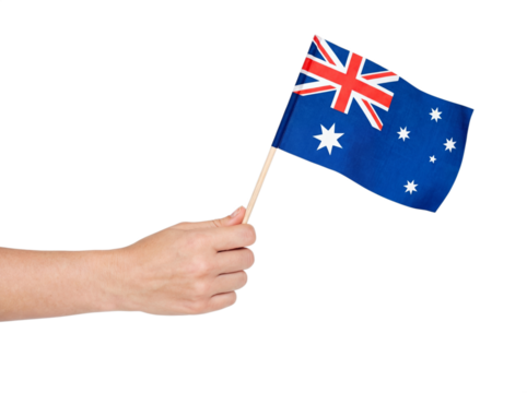 Close up female hand holding Australian flag isolated on transparent background, independence national day of Australia
