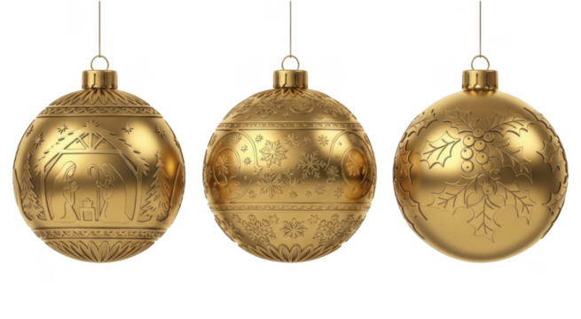 Gold christmas ornaments collection with engraved festive patterns and nativity scene