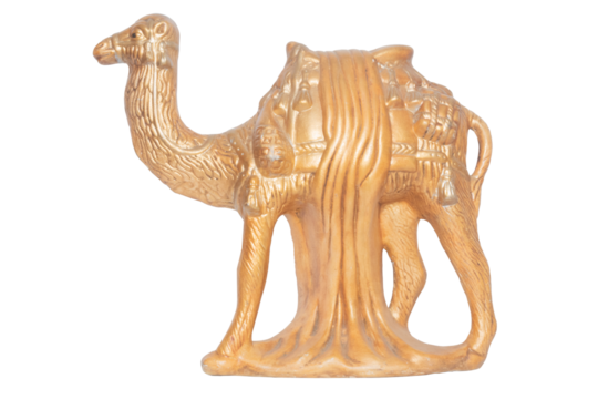 A golden porcelain camel isolated on a white background. Animal theme. Figurine of a nativity scene.