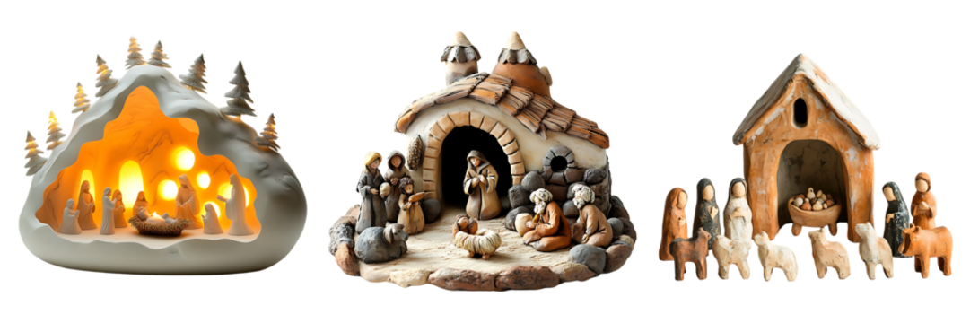 Three Unique Nativity Scenes Illuminated Cave, Rustic Stable, and Shepherd's Shelter set isolated on transparent background