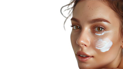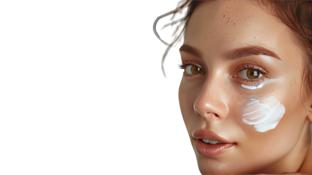 Glowing Beauty: A captivating close-up of a radiant woman with a touch of skincare cream, emanating natural charm and elegance.