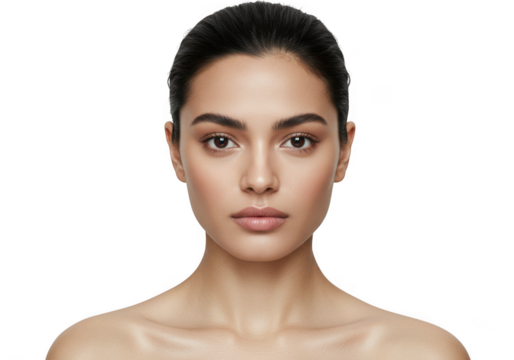 Woman applying concealer makeup on face with smooth skin and natural glow effect isolated on transparent background