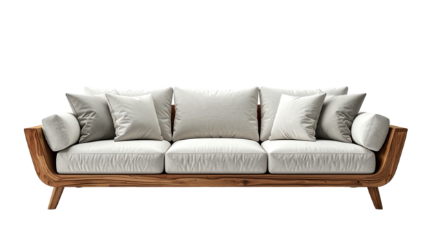 A contemporary three-seater sofa features a wooden frame and light-colored fabric, showcasing a clean and modern design.