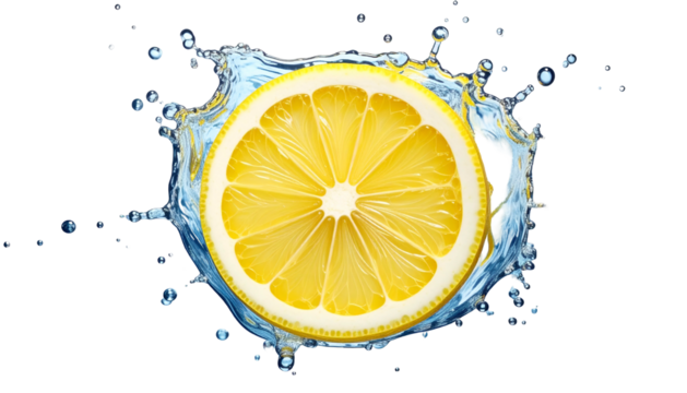 A vibrant image features a lemon slice centered in a burst of transparent water droplets, isolated on a black background