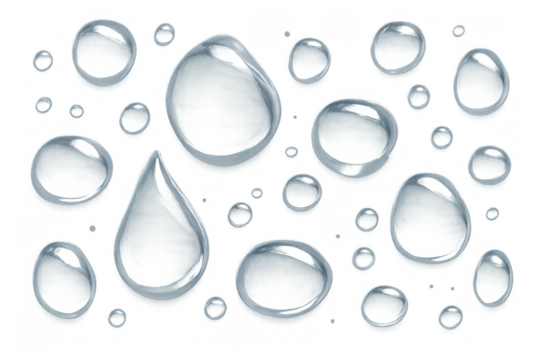 Clear water drops and droplets falling, splashing, or condensing with transparent background, motion blur effect