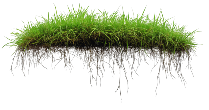 Lush green grass clump with intricate root system exposed and hanging down isolated on a transparent background