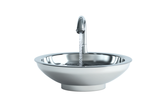 A sleek, modern stainless steel sink with water flowing from the faucet, conveying cleanliness and hygiene.