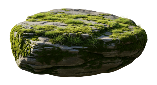 Moss-Covered Rock with Grass and Lichen on Transparent Background