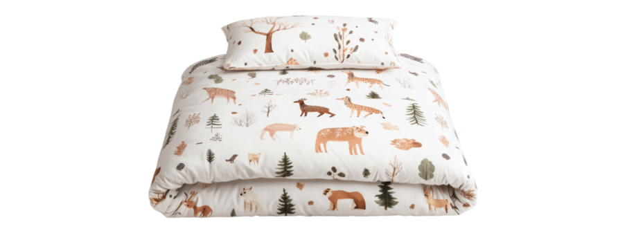 A cozy children's bedding set featuring a white duvet cover and pillowcase decorated with a whimsical woodland animal and nature print. Perfect for a nature-themed bedroom.