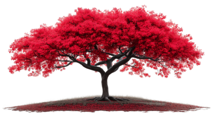 A vibrant red tree stands alone, leaves ablaze with autumn colors, isolated on a transparent background background removed