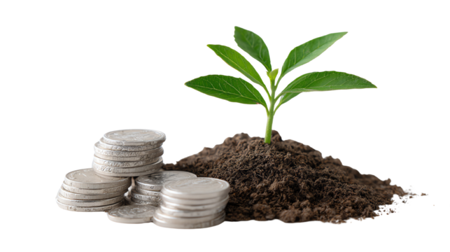 A young plant grows from a mound of soil surrounded by coins, symbolizing financial growth and sustainability.