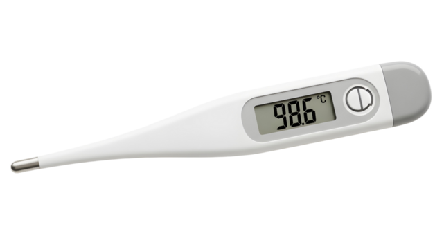 White Digital Medical Thermometer Product Shot Showing 98.6 Degrees Fahrenheit isolated PNG with Transparent Background
