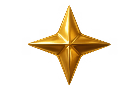 Gold four-pointed star symbol with metallic shine, compass rose design, navigation and direction concept, transparent background