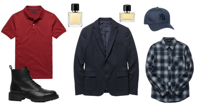 LIFESTYLE - Men's casual and formal clothing collection including red polo shirt, black leather boots, navy blazer, plaid shirt, baseball cap, and two perfume bottles
