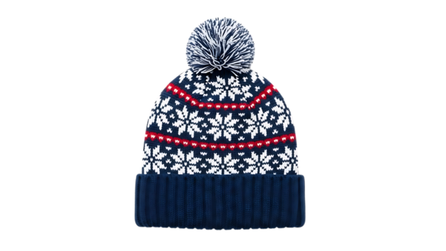 Knit winter beanie with white red and navy snowflake pattern and pom, cutout, PNG isolated on white or transparent background