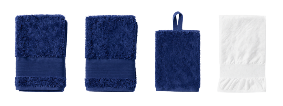 Four towels in a row, two navy blue with textured fringes and dark bands, one navy blue with a handle, one white with a textured pattern and fringed bottom.