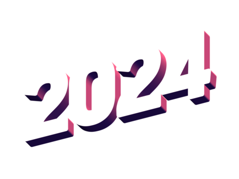 2024 Year, Bold 3D Lettering Banner Design, Vibrant and Neon Colors, Typography, Magenta Purple Light Blue Color Transparent