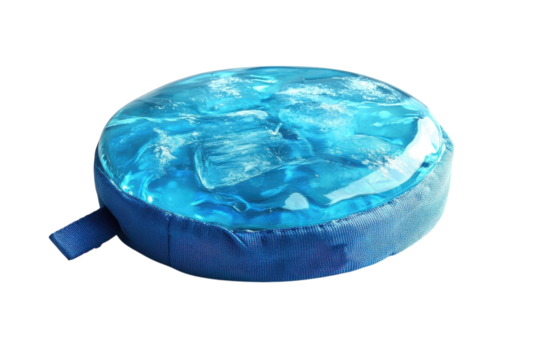 A soothing blue gel cushion offering cool comfort and relief, encased in soft navy fabric with a convenient strap.