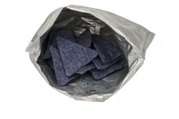 Blue corn tortilla chips filling an opened silver snack bag against a transparent background