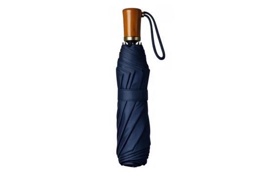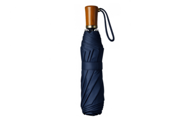 Blue compact folding umbrella providing protection from rain, a personal accessory with a wooden handle