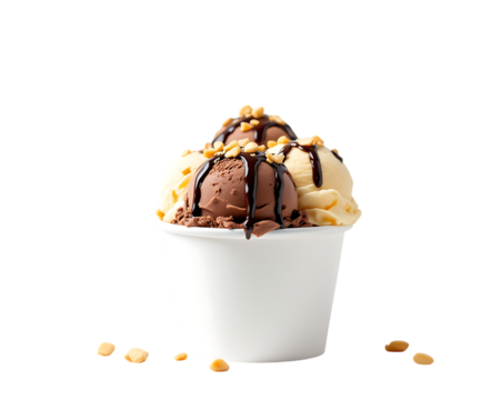 A cup of Neapolitan ice cream with chocolate sauce and nuts, Isolated on transparent background