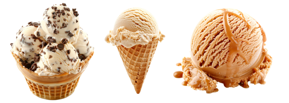 Scoops of sweet and creamy flavored ice cream isolated on white transparent background.