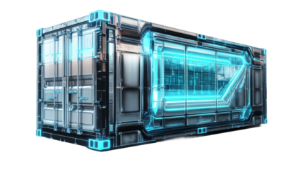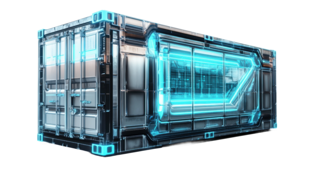 Futuristic metallic cargo container with glowing blue lights on transparent background