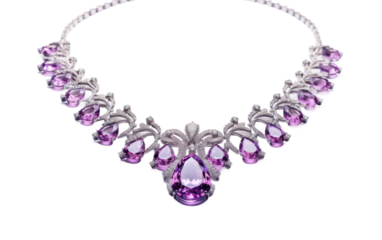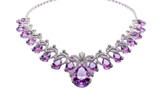 Crystal jewel bead style necklet fly in air. Crystal Jewelry bead necklace as gemstone for fashion ornament decorative items. Fashion ornament necklace to add more style. White background isolated