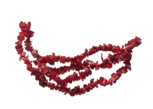 Red stone rock bead style necklet fly in air. Red chilli color bead necklace as gemstone for fashion ornament decorative items. Fashion ornament necklace to add more style. White background isolated