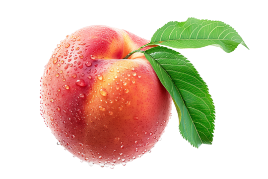 A closeup view of a ripe, fresh peach or nectarine covered in dew drops, surrounded by green leaves isolated on white background.