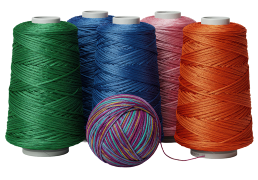 Hyperdetailed macro view of six glossy mercerized cotton embroidery floss spools in rich ruby, sapphire, and emerald jewel tones, standing on a pristine transparent studio background, concept of
