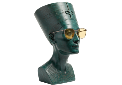 Nefertiti bust with sunglasses isolated on transparent background, ancient Egyptian queen statue in green patina finish PNG