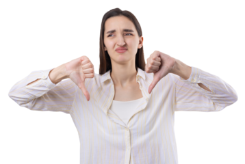 Angry young Asian man showing rejection and negative with thumbs down gesture isolated on transparent background