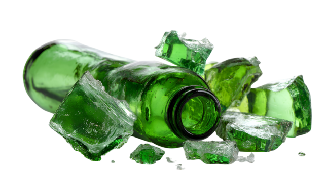 A yellow construction hard hat is severely cracked and shattered, with fragments lying nearby, revealing its inner structure.