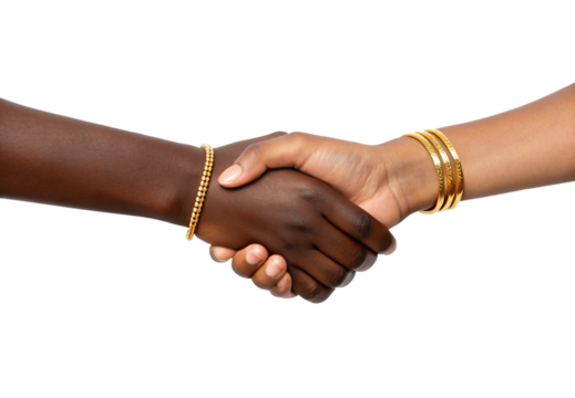 Handshake between two people, diverse skin tones, gold bracelets, isolated on a transparent background