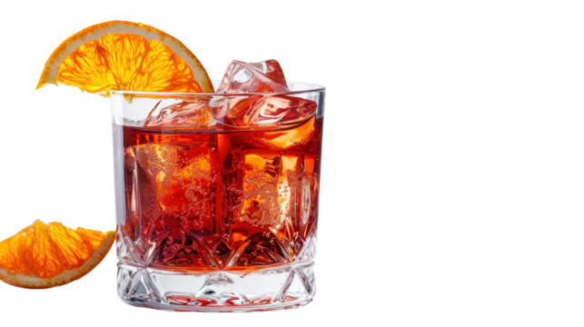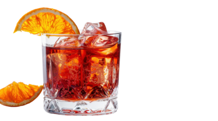Negroni cocktail with orange slices and ice cubes on transparent background