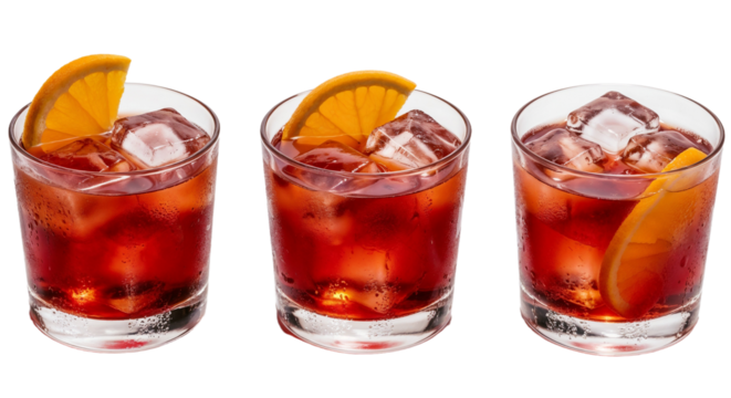 Variety of negroni cocktails with orange garnish and ice cubes in glasses png