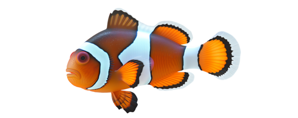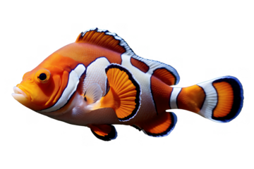 High-quality image of a vibrant clownfish with orange, white, and black stripes, isolated on a white background. Ideal for marine and aquatic themes.