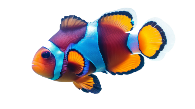 A vividly colored clownfish with distinct patterns, isolated as a png on a transparent, white background