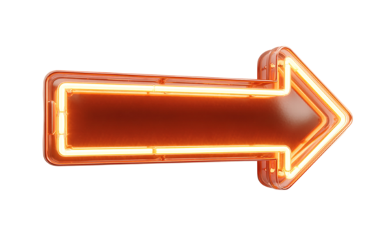Illuminated orange neon arrow sign pointing right, glowing with bright light for retro advertising isolated on transparent background