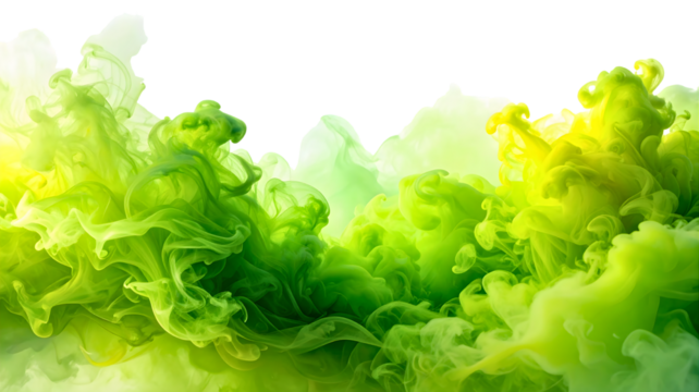 Green smoke fog overlay, bright neon lime mist texture isolated on transparent background for toxic gas or fantasy effect